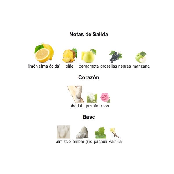 - Salida: limón (lima ácida), piña, bergamota, grosellas negras y manzana.