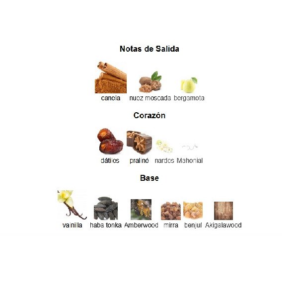 • Fondo: vainilla, haba tonka, amberwood, mirra, benjuí, akigalawood